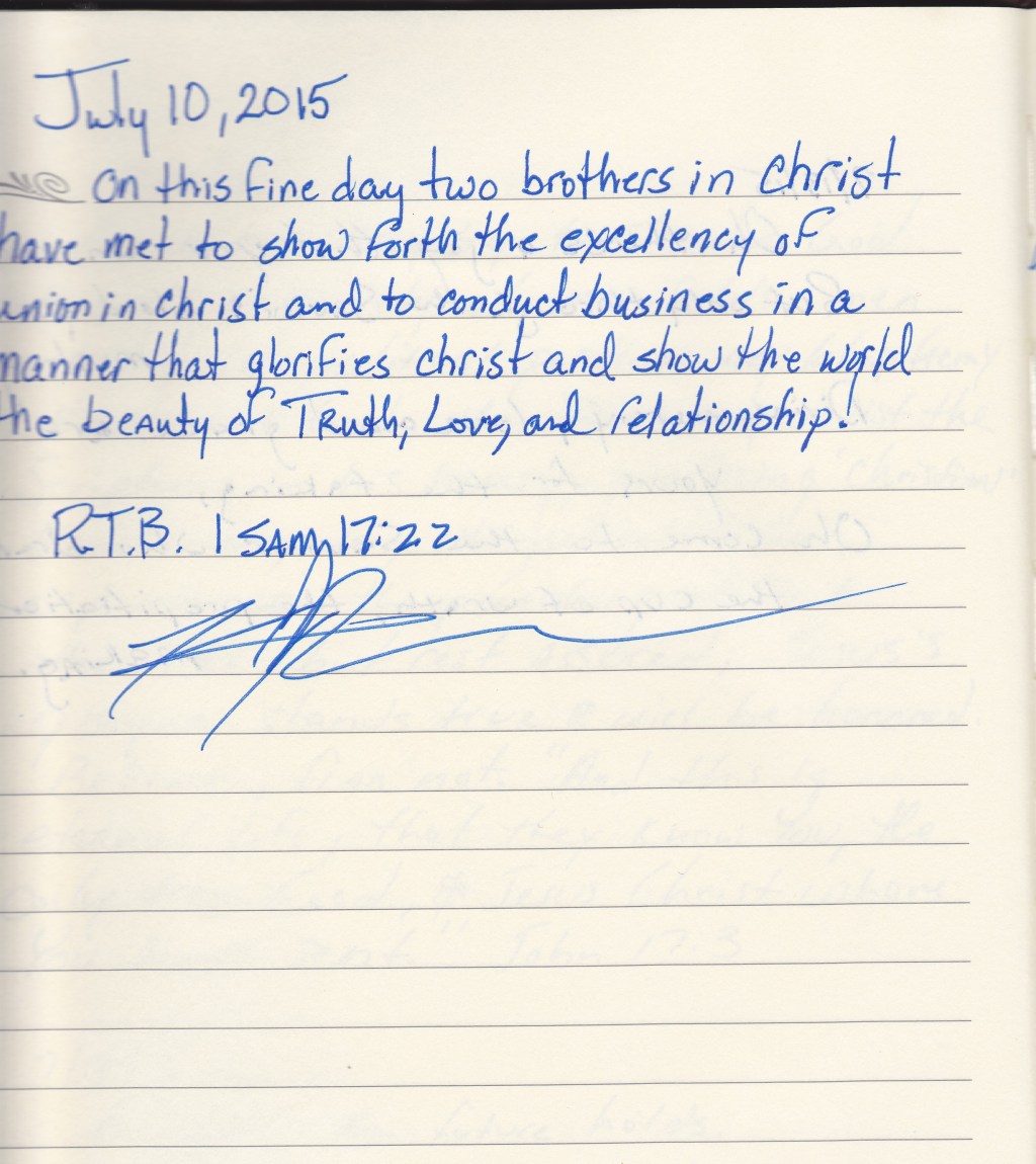 By the end of June we sensed the Lord having us to sell our home and buy a dear brother’s home in Bartlesville. It seemed what the Lord had impressed upon me, He also impressed upon my wife. In early July I met up with this dear brother. It was a spur of the moment meeting, with an unplanned agenda other than simple fellowship. Little did I know, but this brother and his wife were setting out to sell their home. I walked into his back yard and sat down to talk. Little did I know, a pastor and brother in Ireland texted him two hours prior telling him that he and his church were praying that a buyer would literally walk into his backyard. Three days later, we met up at the coffee shop and he wrote a short agreement in my journal, it was our motivations for his sale and our purchase – literally two brothers in Christ agreeing to work together in the transaction for the glory of
