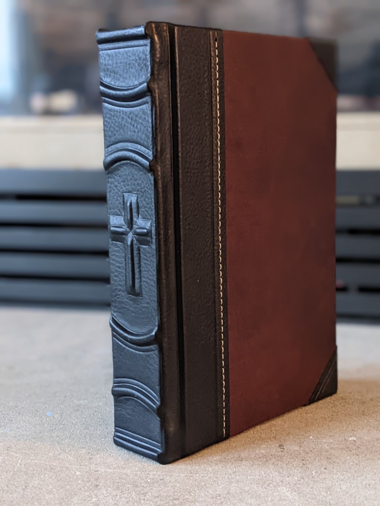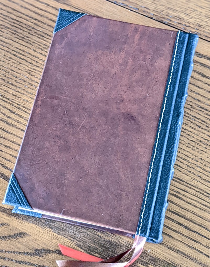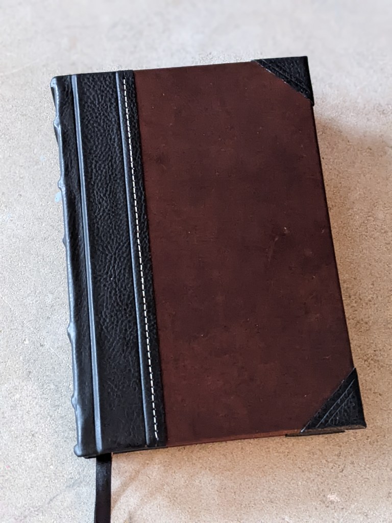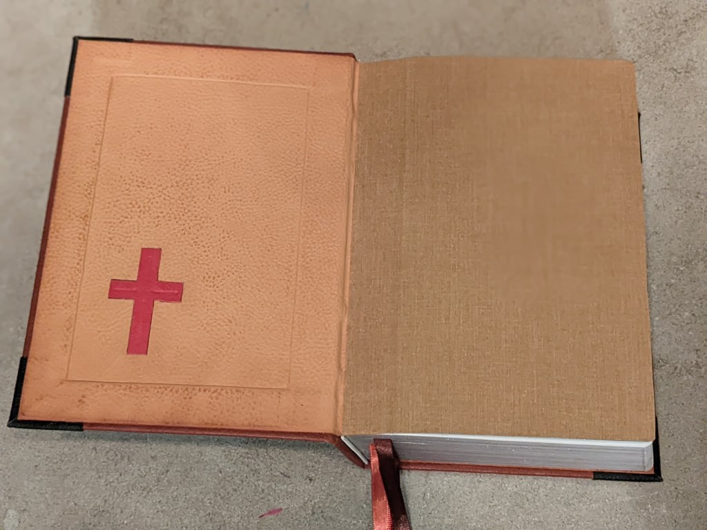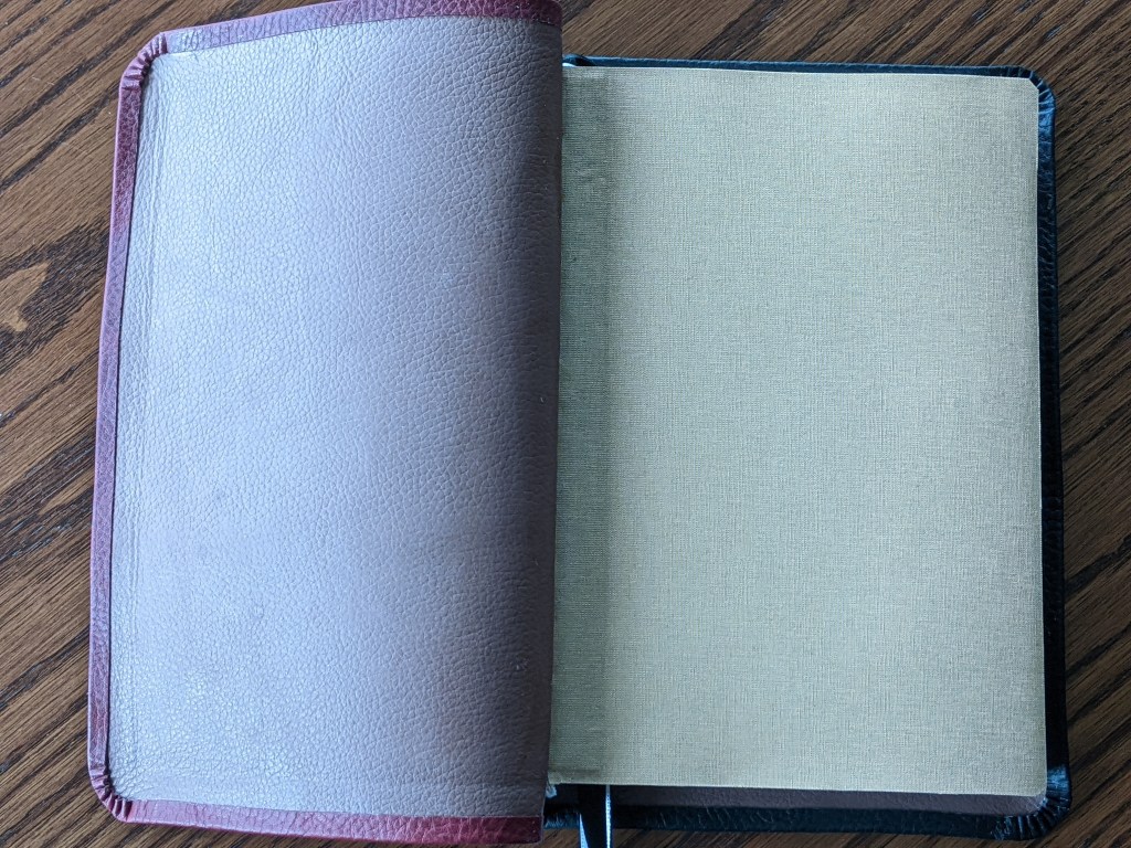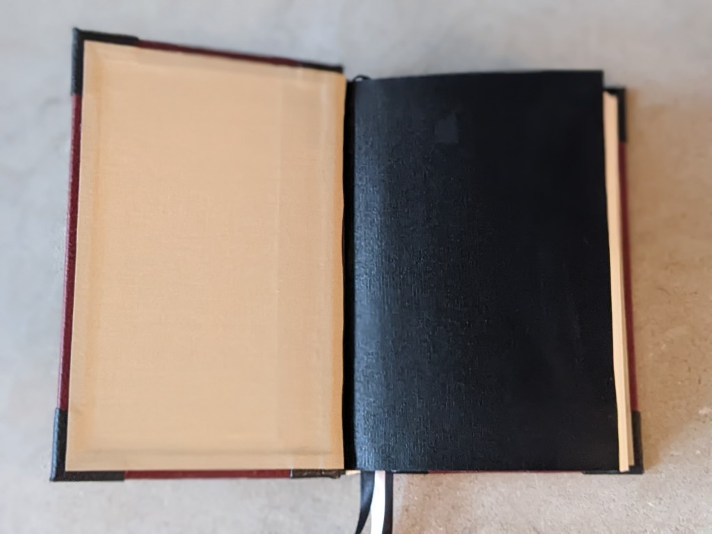 This gently used hardback has been rebound in whiskey/cognac and black Badalassi Carlo (Minerva Box) with natural Badalassi Carlo on the inside and features an oxford hollow (not common to hardbacks) for extra durability, new tail bands, three 3/8″ ribbons, raised cross on spine, and opens completely flat.