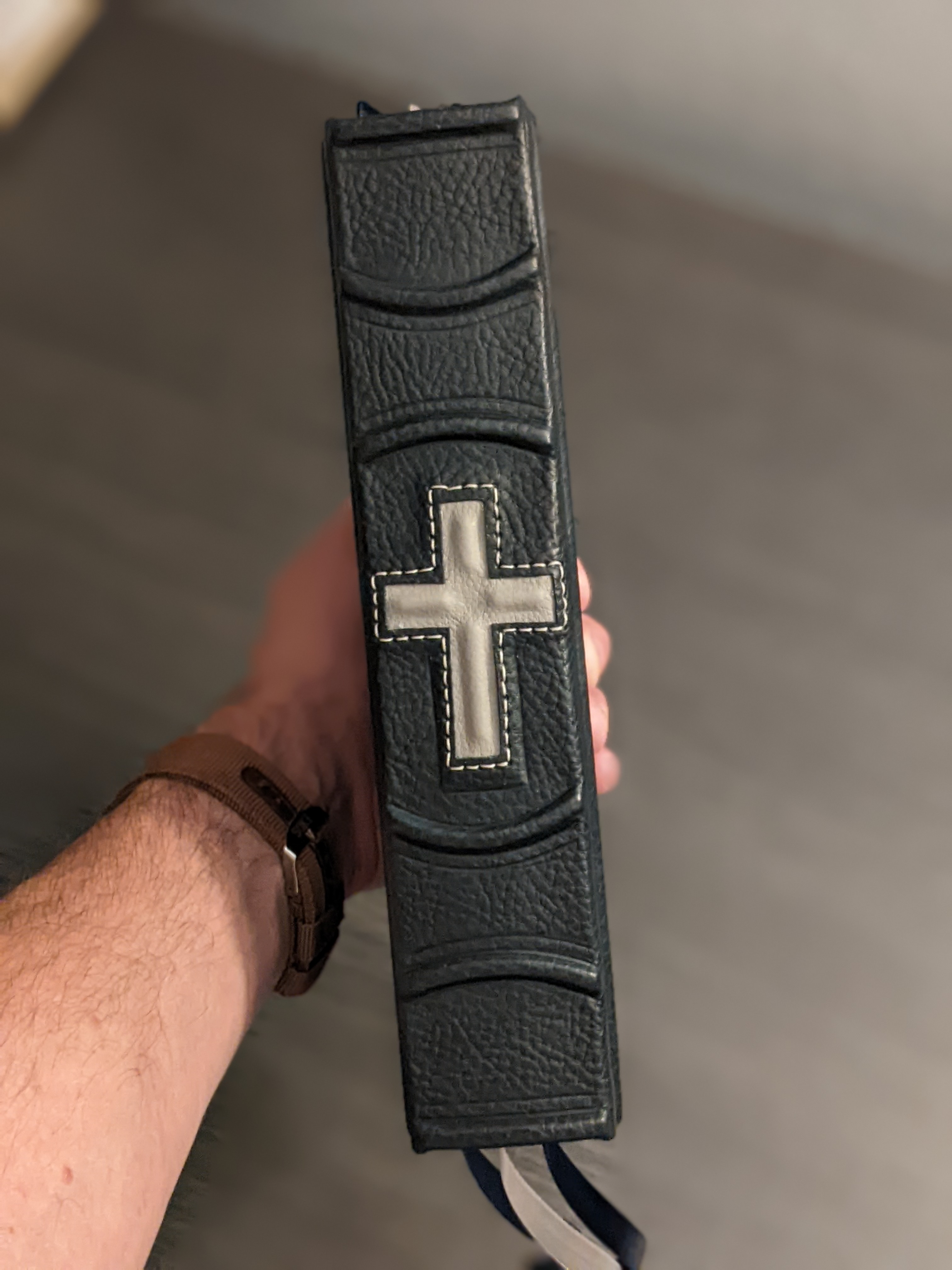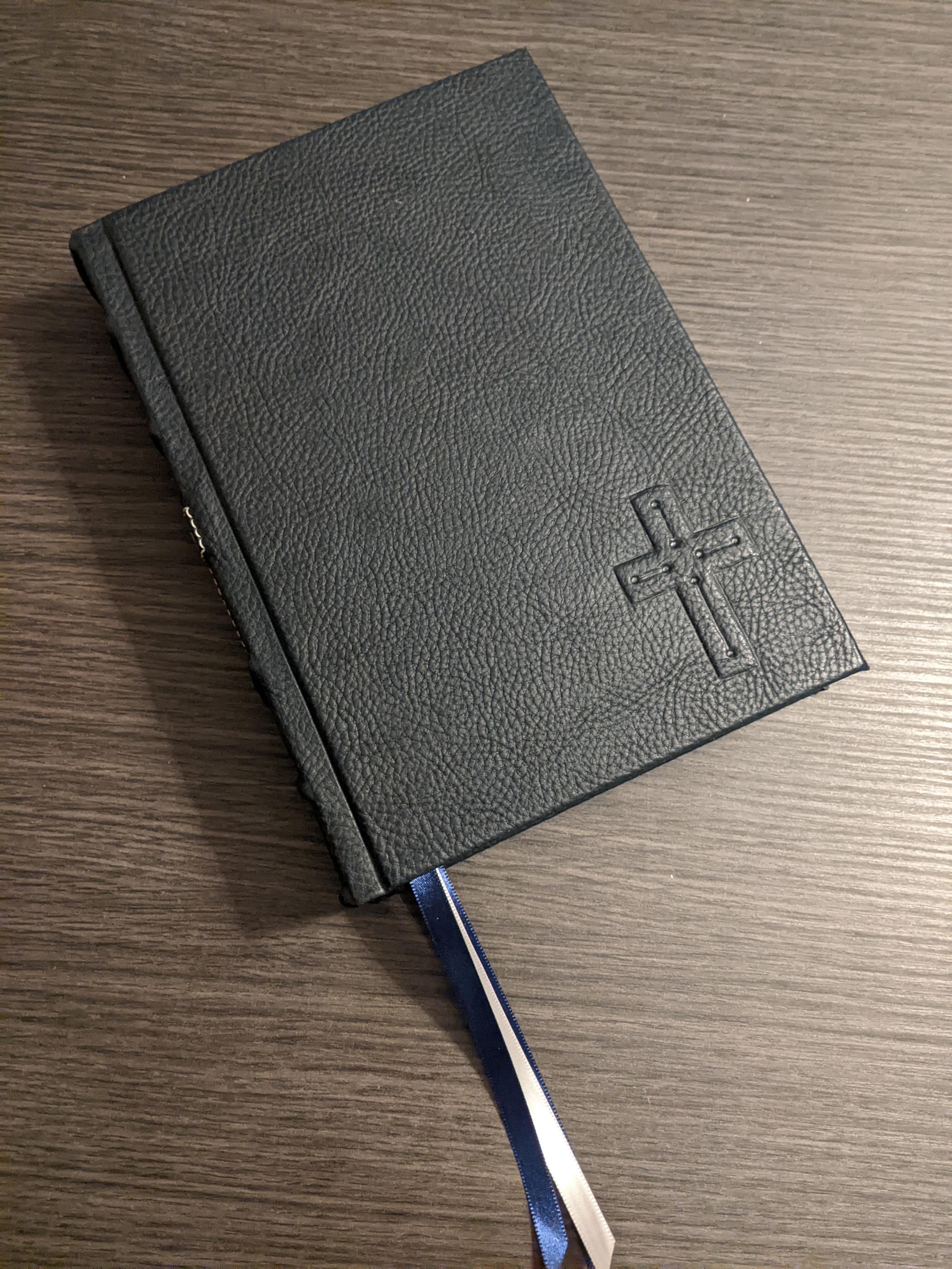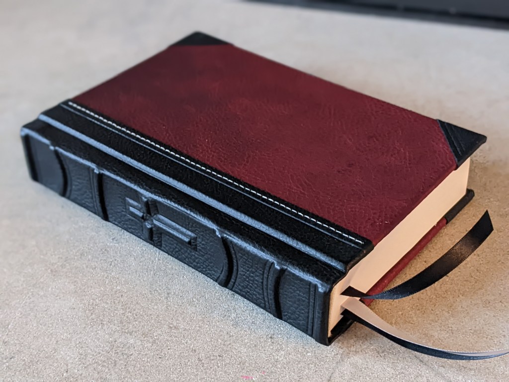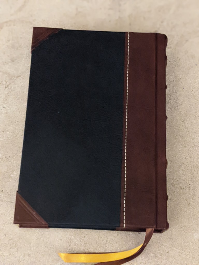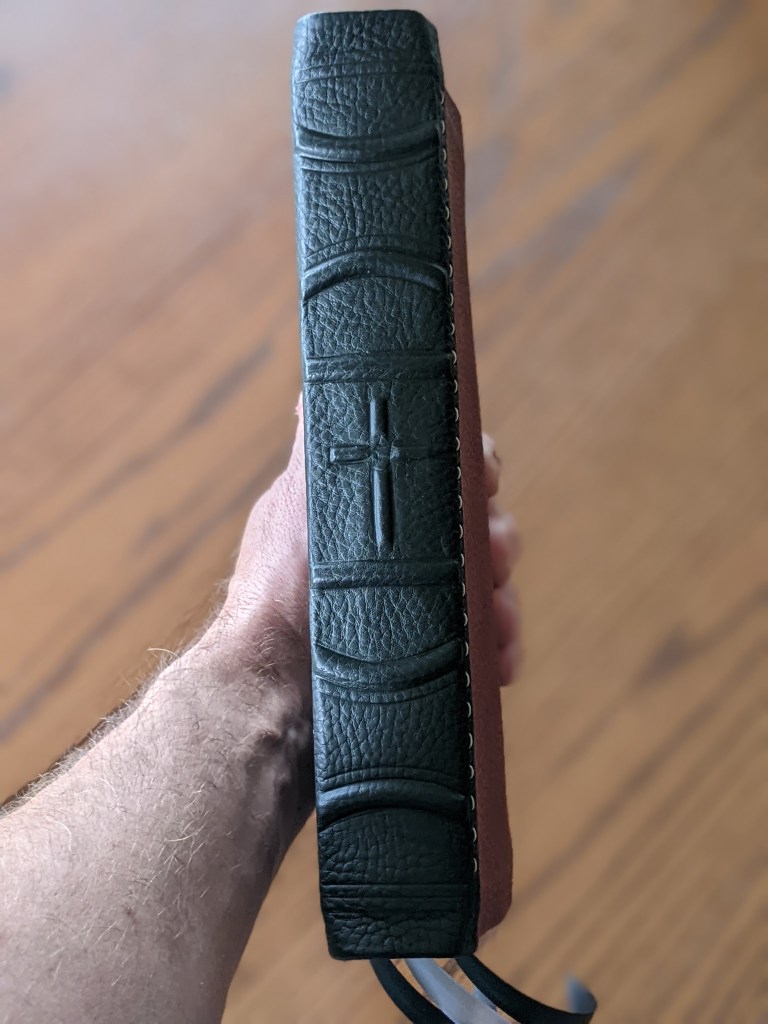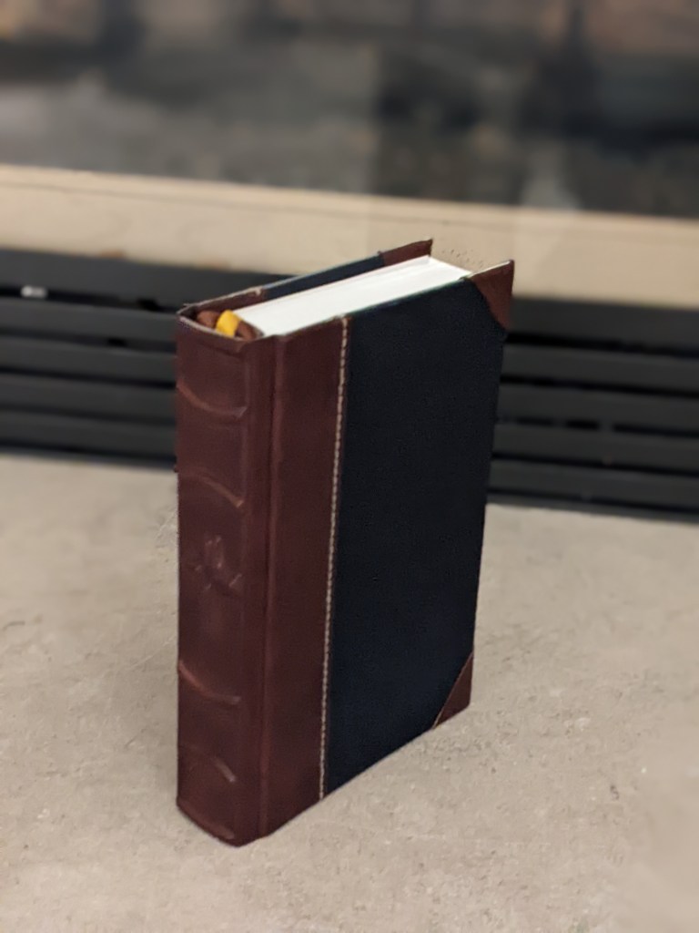 This gently used hardback has been rebound in whiskey/cognac and black Badalassi Carlo (Minerva Box) with natural Badalassi Carlo on the inside and features an oxford hollow (not common to hardbacks) for extra durability, new tail bands, three 3/8″ ribbons, raised cross on spine, and opens completely flat.