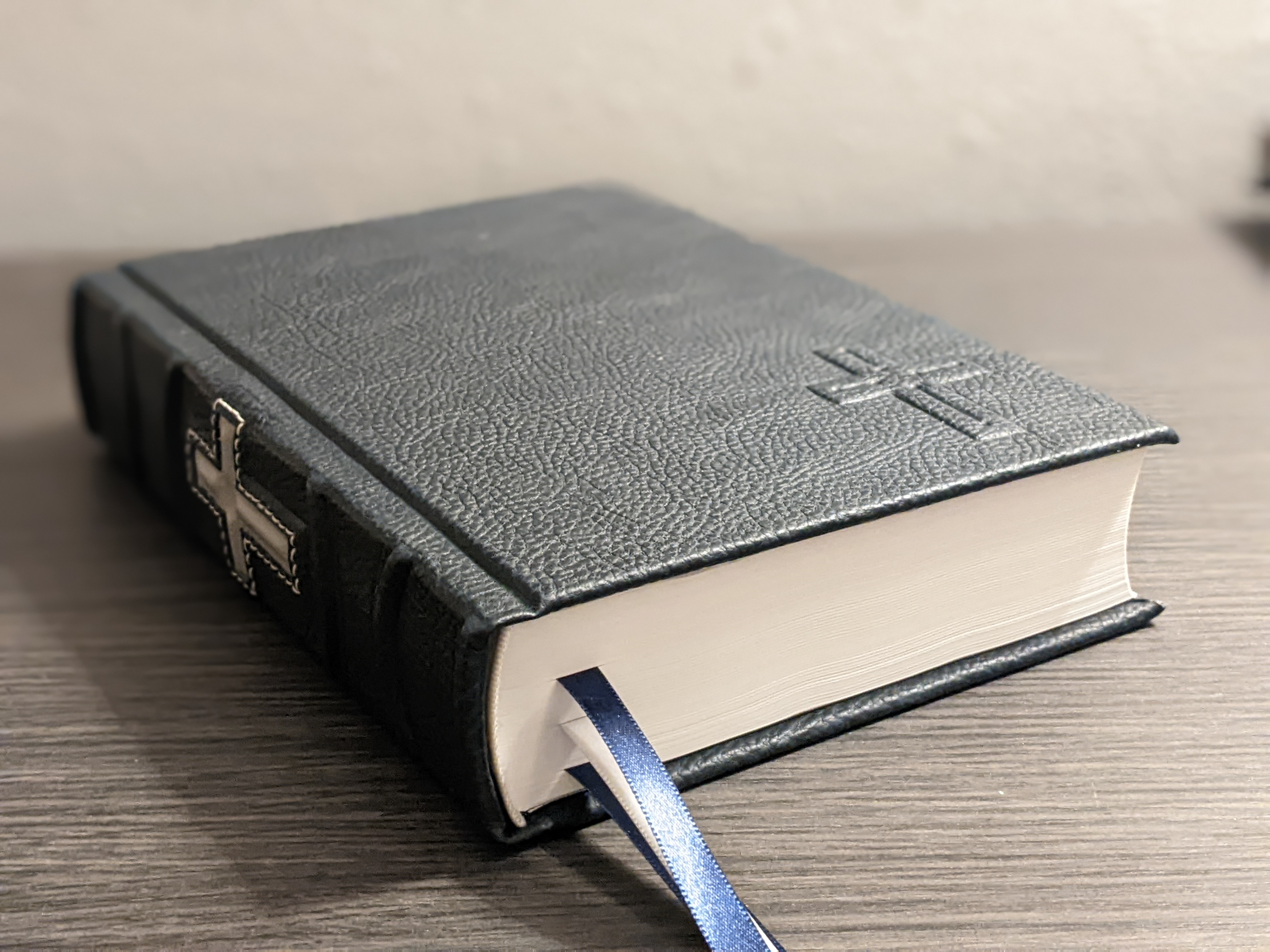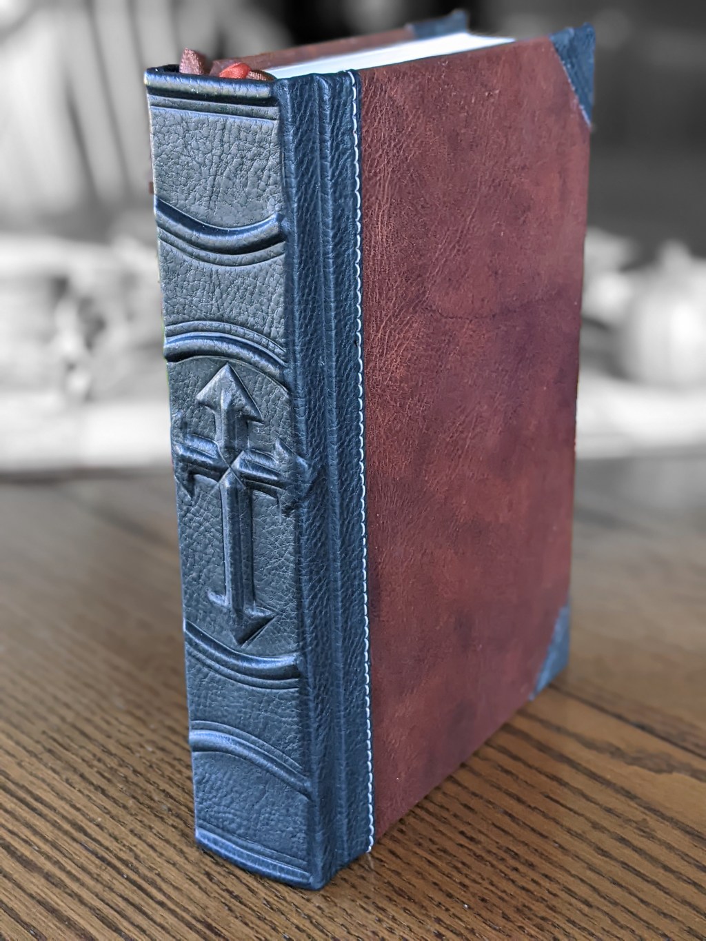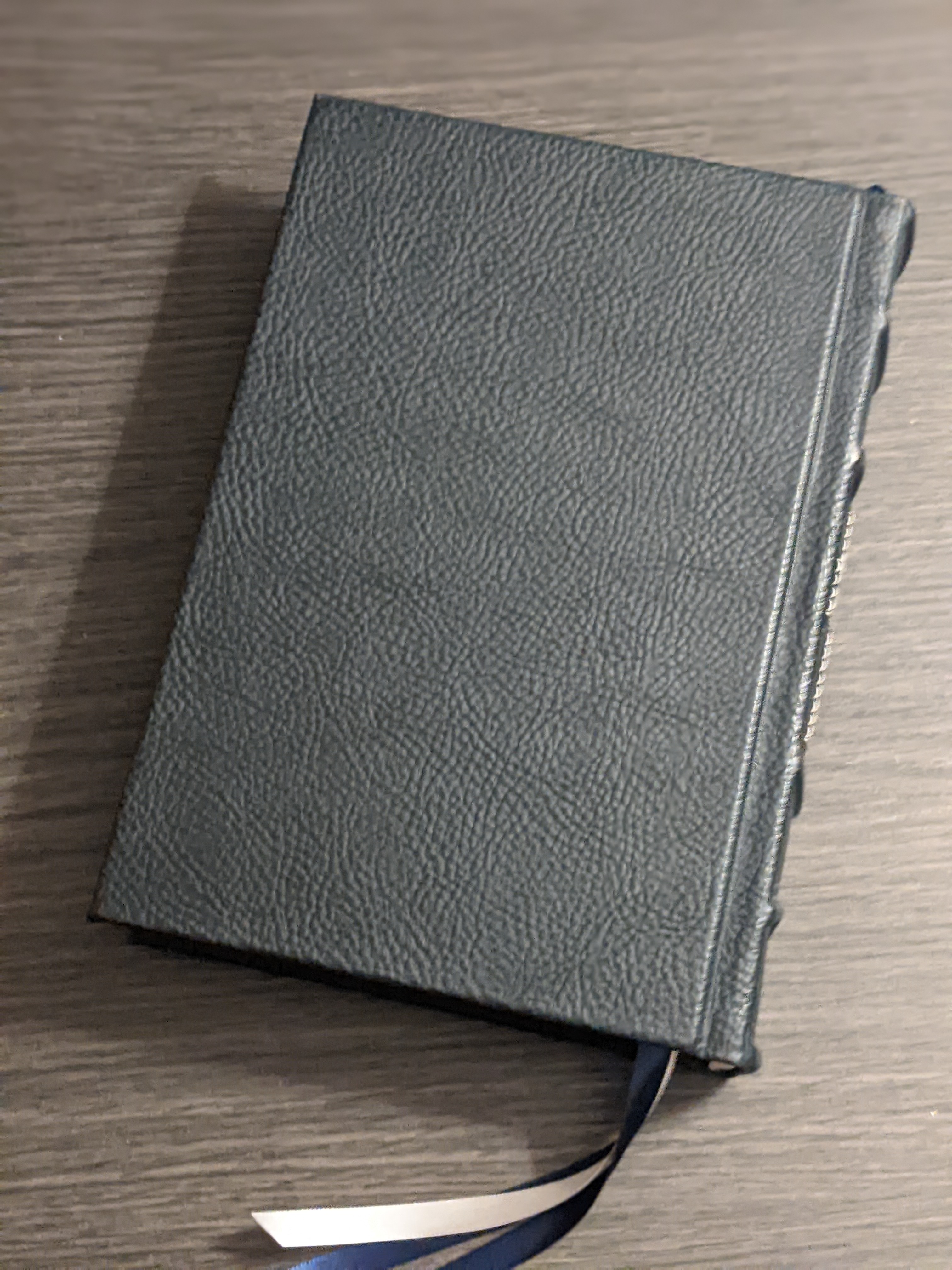 This new LSB hardback has been rebound in sapphire blue and walnut Badalassi Carlo (Minerva Box) and features an oxford hollow (not common to hardbacks) for extra durability, new tail bands, three 3/8″ ribbons, raised cross on spine, and opens completely flat.