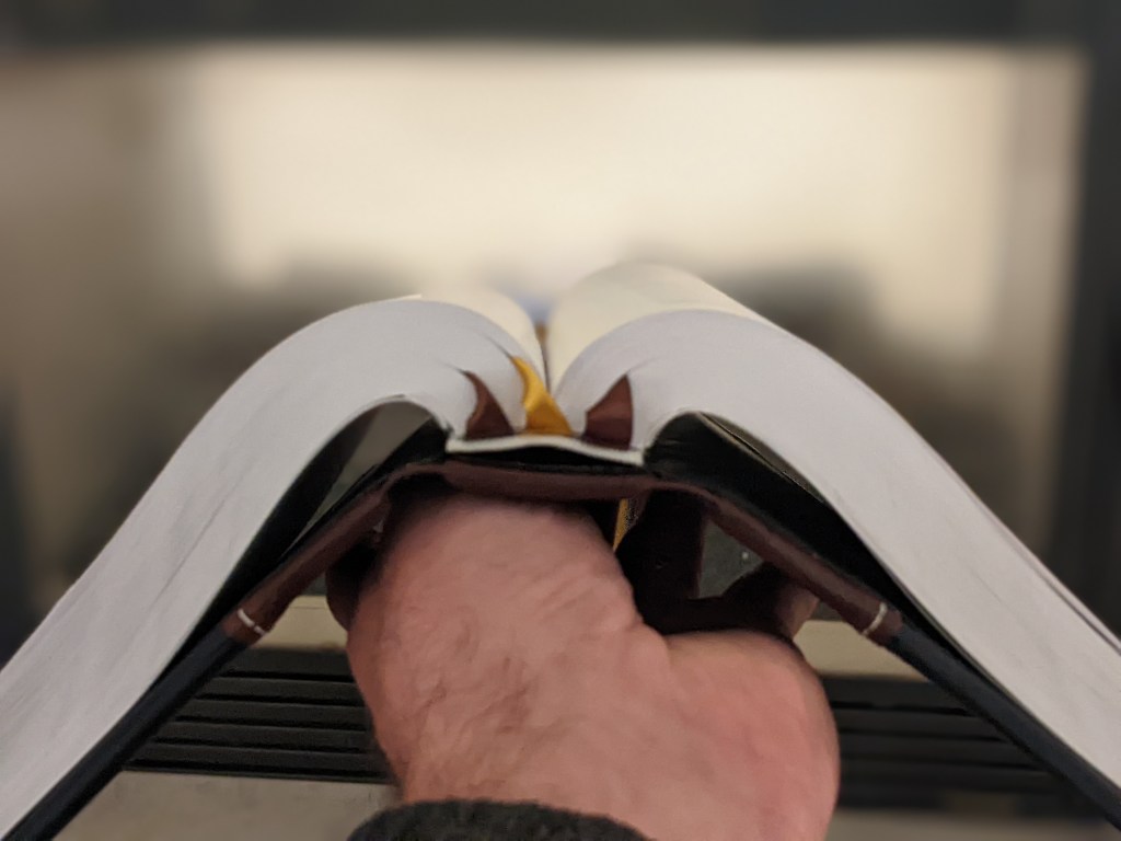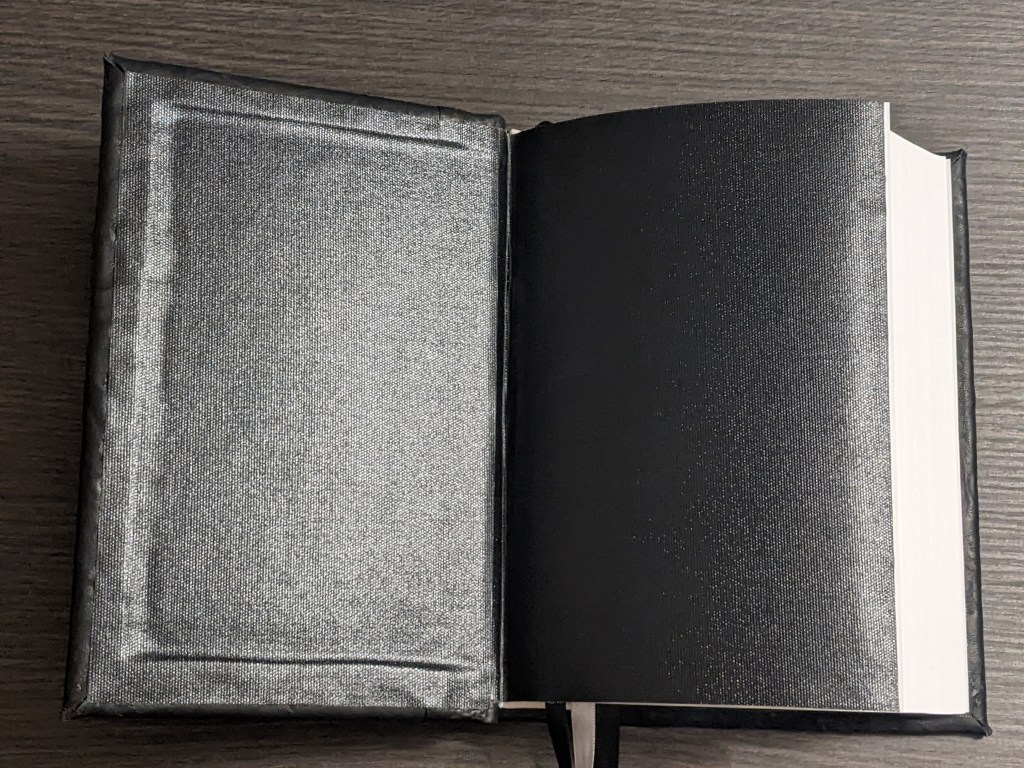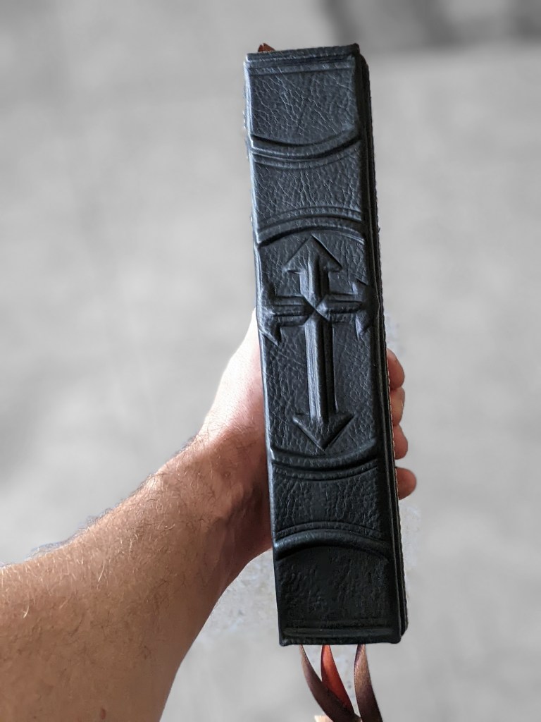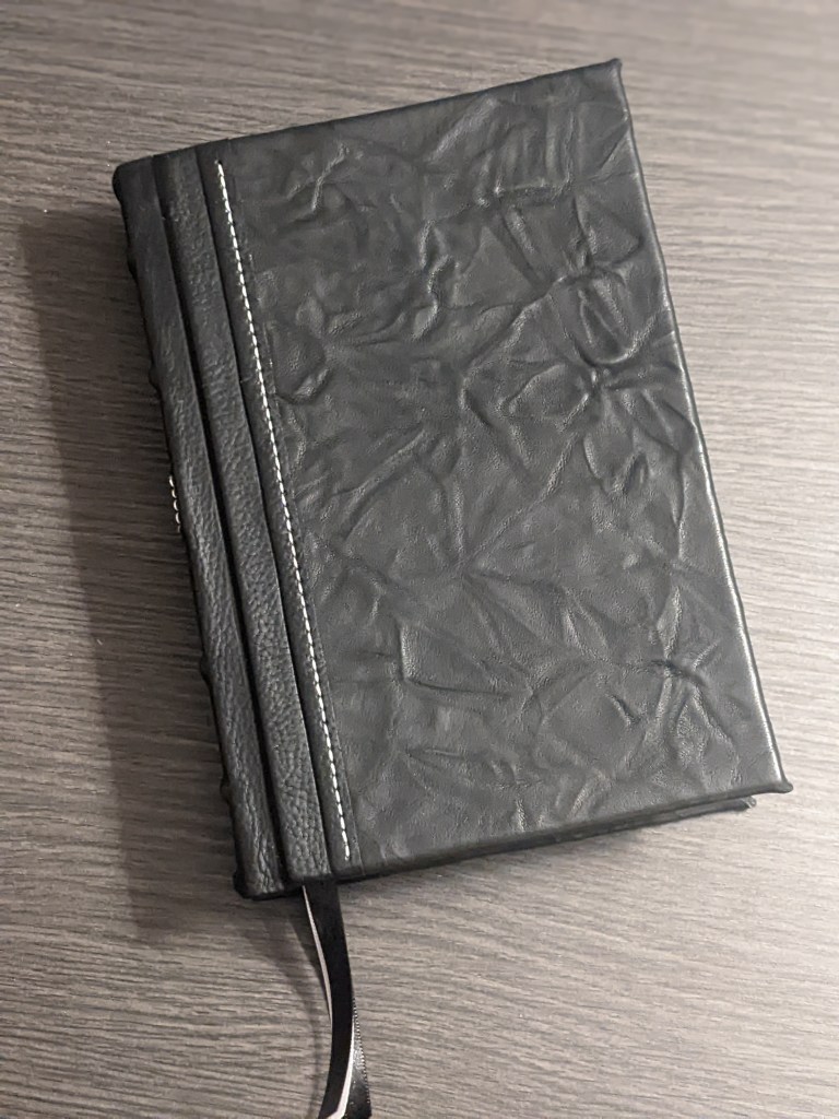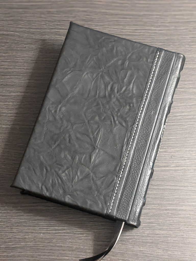 This new LSB hardback has been rebound in Badalassi Carlo (Minerva Box) in Black with Badalassi Carlo (Nemesis) and features an oxford hollow (not common to hardbacks) for extra durability, new tail bands, three 3/8″ ribbons, raised cross on spine, and opens completely flat.