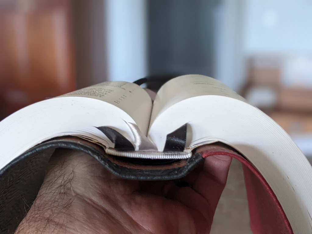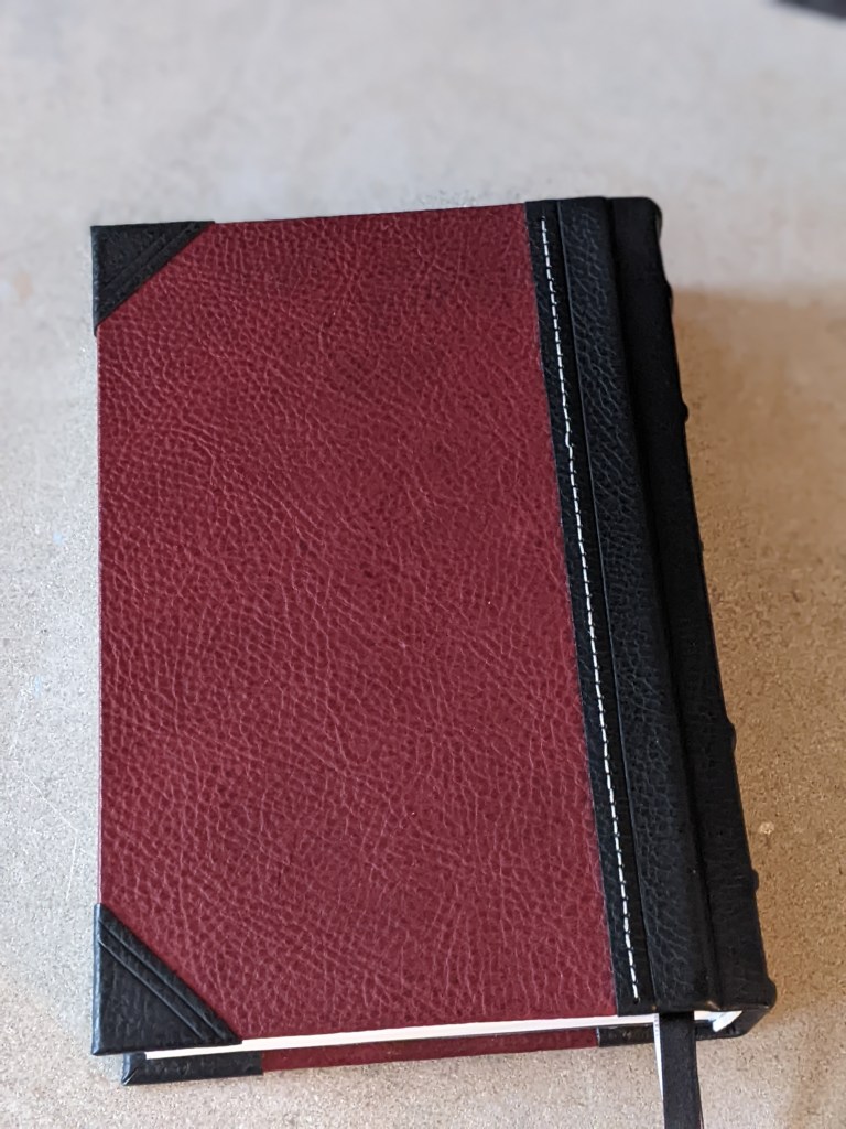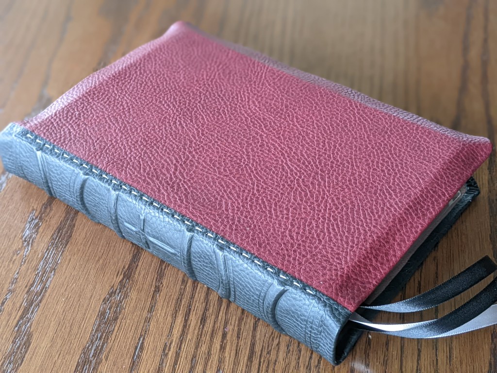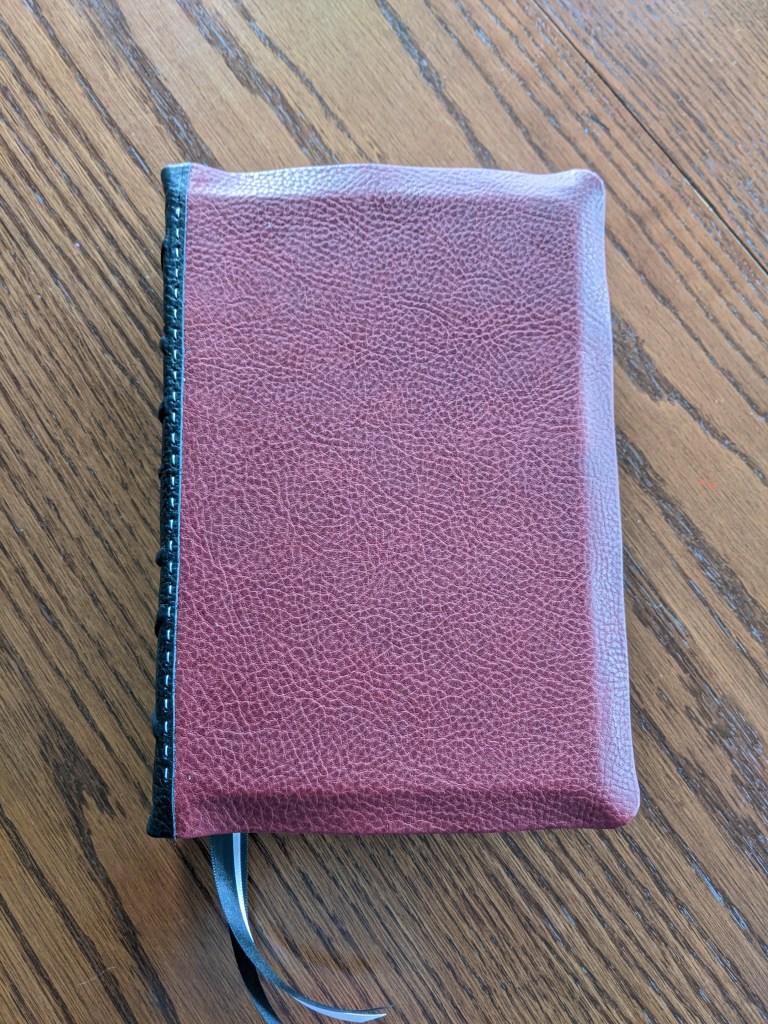 This new LSB softcover has been rebound in Bordeaux (dark red) and Black Badalassi Carlo (Minerva Box) and features an oxford hollow, new tail bands, three 3/8″ ribbons, raised bands and cross on spine, and is very flexable.