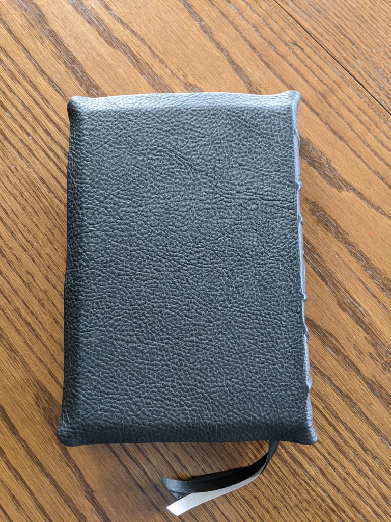 This new LSB hardback has been rebound in black Badalassi Carlo (Minerva Box) along with a thick back calfskin and features an oxford hollow (not common to hardbacks) for extra durability, new tail bands, three 3/8″ ribbons, stitched cross on spine, and opens completely flat.