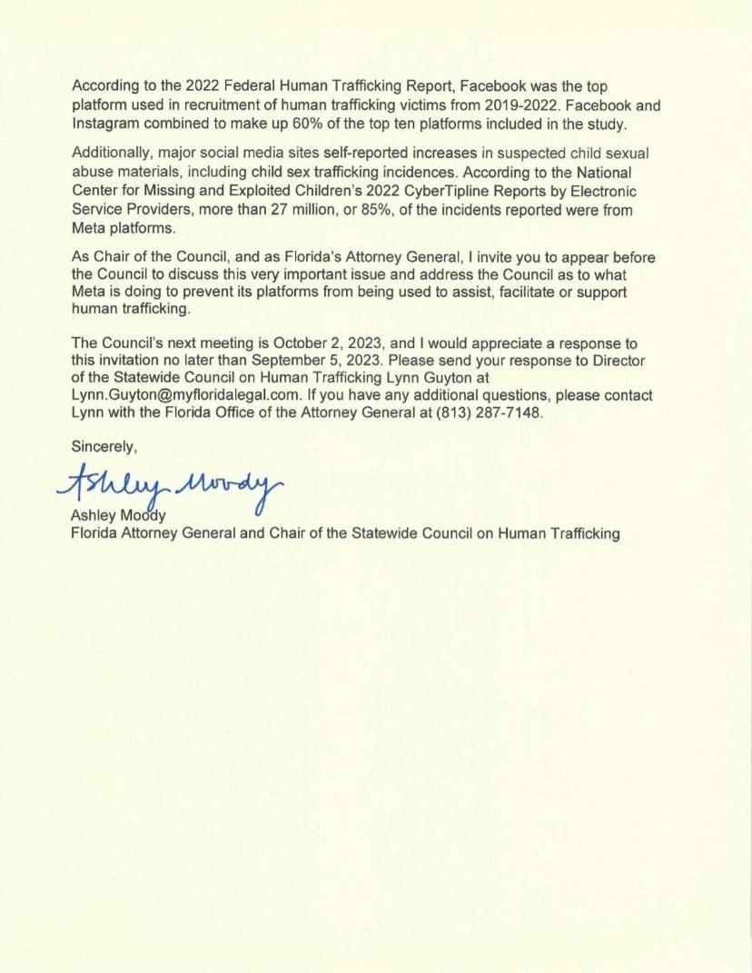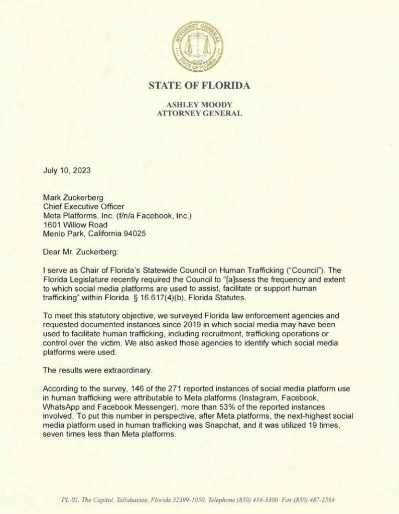 Ashley Moody, the attorney General of the state of Florida, sent Mark Zuckerberg a scathing letter today regarding human trafficking on the Meta platform. Of the 271 recorded instance, 146 were directly attributed to the Meta platform.